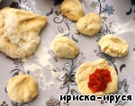 Тесто делим на части. У меня 2 формы диаметром 20, т.е. маленькие, поэтому я разделила на 2 части, а потом каждую часть на 6 шариков. Шарики раскатать и уложить на них по одному виду начинки. Защипнуть, придавая форму шариков.