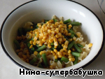 Фасоль опустить в кипящую воду, довести до кипения, варить 3-4 минуты, откинуть на сито и обдать холодной водой. Добавить к макаронам.