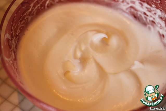 Отдельно взбить белки с 1 ст. л. пудры, до не очень плотных пиков.
