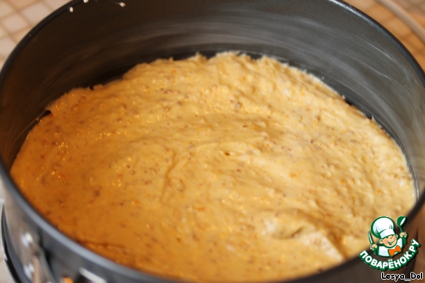 Форму диаметром 18-20 см смазать маслом и выложить дно смазанной маслом бумагой. Вылить половину теста.