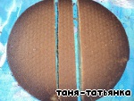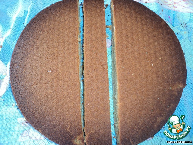 5.Коржи остудить. Хочу поделиться советом, как разрезать корж на два: края немного надрезать ножом, затем взять обычную нитку и, держа её горизонтально, двумя руками, разрезать корж.