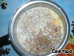 В емкость всыпать цедру, полученный сок, влить два стакана молока и добавить 1,5 стакана хлопьев. Поставить на огонь, постоянно помешивая, довести до кипения и варить 2 минуты. |