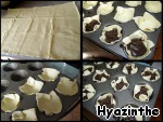 Вложить пластики теста в формы для маффинов (я не смазывала формы), слегка придавить, распределить равномерно начинку, выступающие края теста пригнуть к центру. -