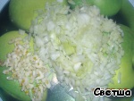 Лук и чеснок мелко порубить, обжарить на сковороде с мясным фаршем.