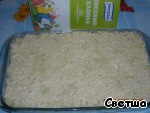 5 слой - вторая половина картофельного пюре. Сыр нужно натереть на крупной терке, всыпать в овощной отвар и перемешать.