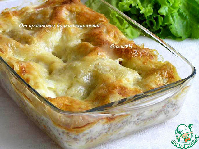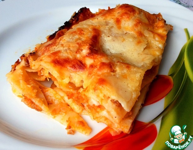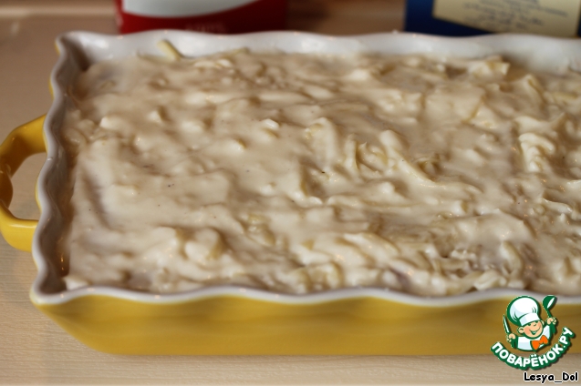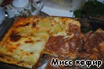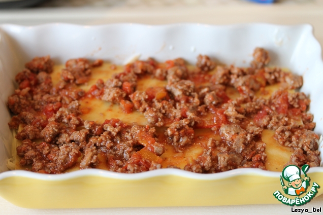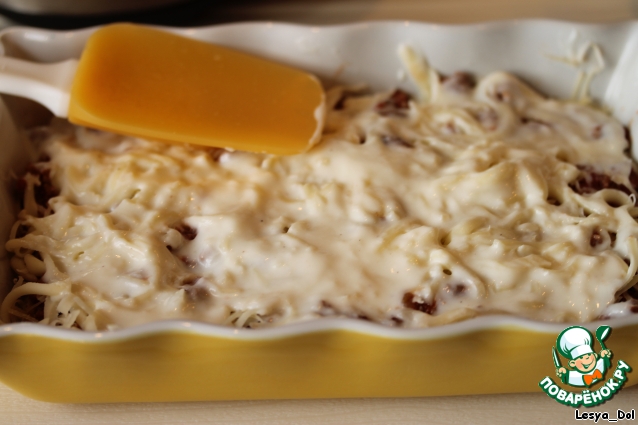 Заливаем соусом бешамель. Далее снова листы лазаньи и так далее. Повторяем еще дважды.