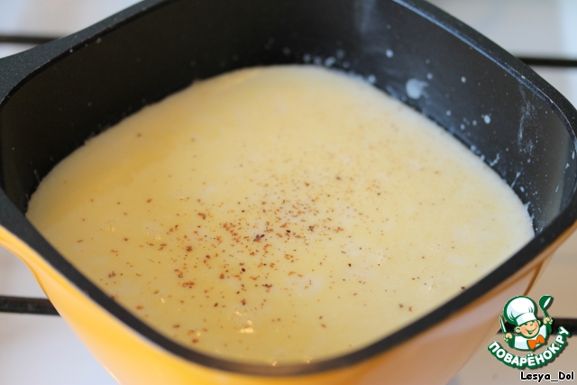 Быстро мешая венчиком, тоненькой струйкой влить молоко, посолить, поперчить, добавить щепотку мускатного ореха. Варить, постоянно помешивая, до загустения. Перелить в чашку, накрыть пищевой пленкой, чтоб не образовалась корочка. Остудить.