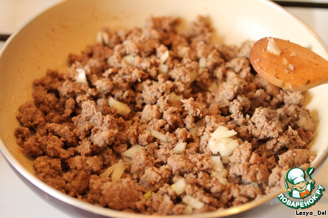Теперь готовим болоньезе. Фарш слегка обжарить на оливковом масле. Добавить рубленый лук. Обжарить до прозрачности. Посолить, поперчить.