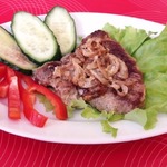 Мясо (филе) разрезать на порционные куски, слегка отбить. Смазать маринадом и уложить в кастрюлю, чередуя с луком. Оставить на ночь.