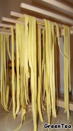 Добавьте в муку яйцо и замесите тесто. Постарайтесь вымесить его как можно лучше. Тесто должно получиться гладкое и эластичное. Я жульничала и использовала специальную машинку для раскатки и нарезки пасты. Если таковой не имеется, тесто тонко раскатайте, сверните в трубку и нарежьте полосками.