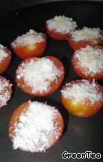 Поставьте на огонь кастрюлю с водой. И пока вода еще не закипела, приступим к приготовлению соуса. Помидоры черри разрезать пополам. Присыпать их смесью из сухарей и сыра, слегка посолить. Уложить на противень и запечь в предварительно разогретой духовке 200°C в течение 10 минут.