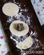 Тесто раскатать в тонкий пласт. Вырезать круги диаметром не менее 4 см. В середину уложить начинку и защипнуть полумесяцем. -