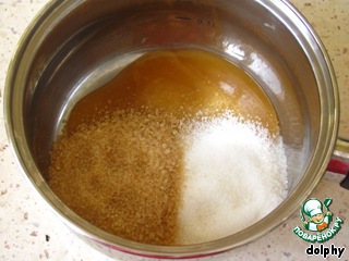 В небольшой кастрюльке соедините мед, коричневый и простой сахар и 2 ст. л. воды.