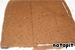 Готовый бисквит остудить на противне и переместить на чистый лист пекарской бумаги. Разрезать на 3 коржа 22х18 см, получаются 2 целых коржа и 1 из двух половинок, его мы поместим внутри торта. -