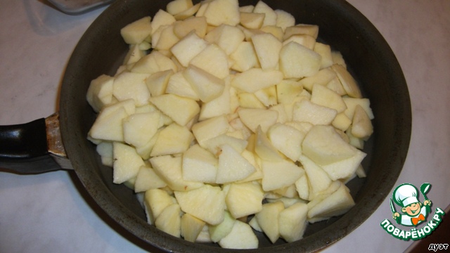 Очистить и нарезать произвольно яблоки, обжарить их недолго на сливочном масле 2-3 мин., остудить (остывают быстро) и добавить 1 яйцо. Хорошо перемешать.