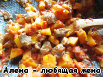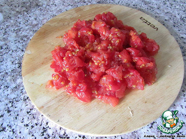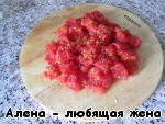 Помидоры очистить от кожицы и семян, нарезать кубиками (у меня свои замороженные уже нарезанные помидоры, без кожицы, но с семенами)