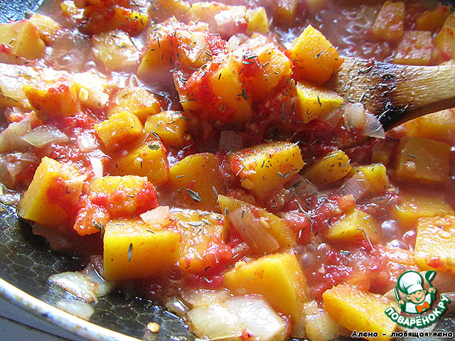 Добавить тыкву, помидоры, тимьян, соль, перец и сахар по вкусу, тушить на среднем огне минут 10