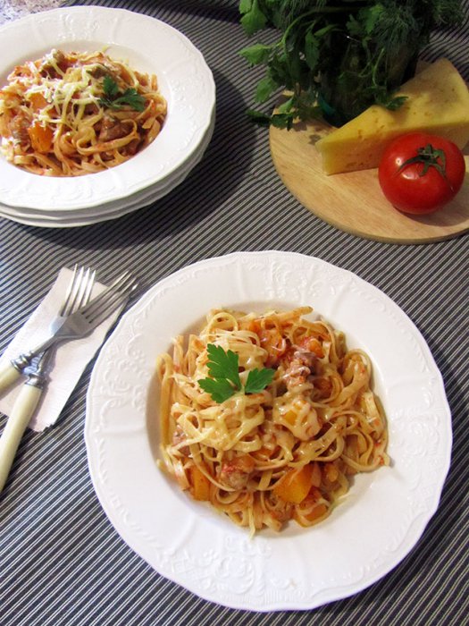 Pasta con zucca e carne. Девочки, это что-то невероятное, даже не знаю, как выразить свой восторг по поводу этой пасты. Слегка сладковатая рассыпчатая тыква, сочное мясо, нежная паста и тонкий аромат вина, все это так идеально сочетается и дополняет друг друга. Рассказать это невозможно, нужно пробовать…