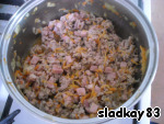 Добавить фарш и нарезанную мелкой соломкой ветчину (я резала кубиками), немного потушить до изменения цвета.