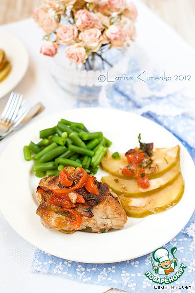 Подавать с овощами, или любым вами любимым гарниром. У меня с вареной стручковой фасолью. Очень вкусно - нежное мясо, сочная начинка и пикантное запеченное яблоко – попробуйте, вам понравится!