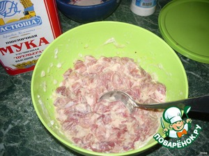 Мясо режем на мелкие кусочки, приблизительно 1х1 см. добавляем майонез, лук, муку, приправы, соль. Перемешиваем.