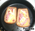 Нагреваем сковородку, подливаем масло, чтобы шкварчила, кладем 2 каркаса от кусочков хлеба.