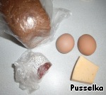 Для приготовления завтрака необходимо 2 яйца, 2 ломтика хлеба, сыр, соль, перец, колбаса, подсолнечное масло.