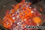 К фаршу добавим: нарезанный красный лук, натертую морковь и 1 яйцо. Соль и перец - по вкусу.