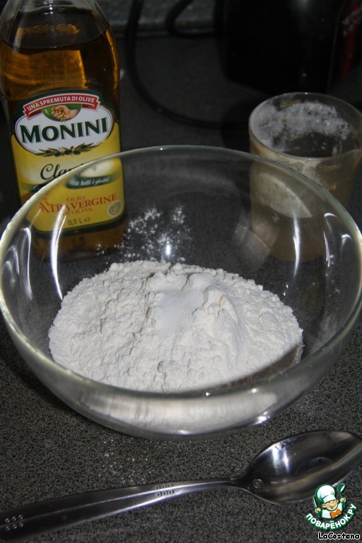 Подготовим тесто: нам нужно оливковое масло, мука, вода и соль.