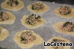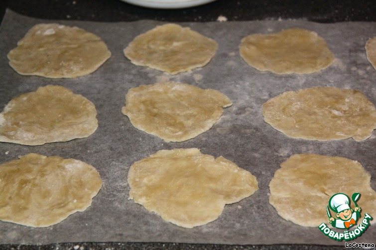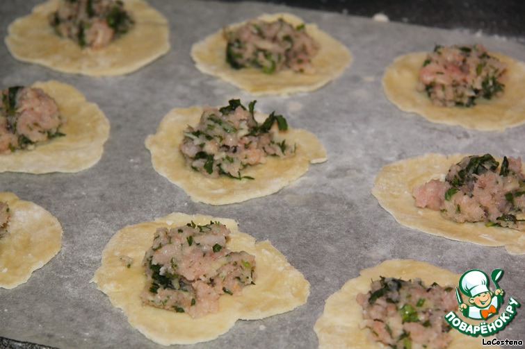 Положим начинку и защипнем края. Чтобы пельмени не раскрылись, края я смачивала водой.