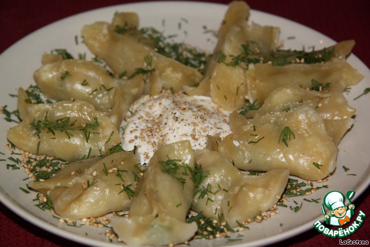 Готовые пельмени украсила укропом и подала со сметаной и кунжутом! Приятного аппетита!)