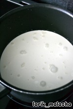 В кастрюле смешать сливки (жирность любая, но чем жирнее, тем сливочнее будет вкус), молоко и сахар. На медленном огне довести до кипения.
