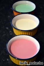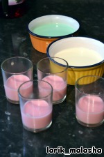 В одну из них ввести фруктовый сироп (красного цвета - клубничный, гранатовый, вишневый и пр.).
