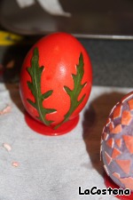 Готовое яйцо получилось ярким и необычным. Можно снять зеленые листья и на их месте будут белые эскизы, но мне понравился вариант с зелеными листами.