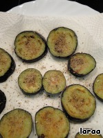 Баклажаны нарезать кружочками. И обжарить в чесночном масле с двух сторон. выложить на салфетки, чтобы стекло масло. Посолить и посыпать перцем и смесью трав "Тоскна" (орегано, тимьян, розмарин, майоран, шалфей)