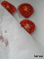 Помидоры нарезать кружочками и промокнуть салфеткой. Присолить. Рикотту также посолить и добавить перца.