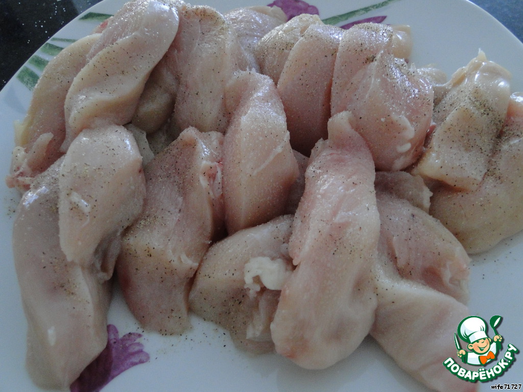 Курицу нарезать на брусочки. Посолить, поперчить, перемешать и отставить на несколько минут.