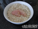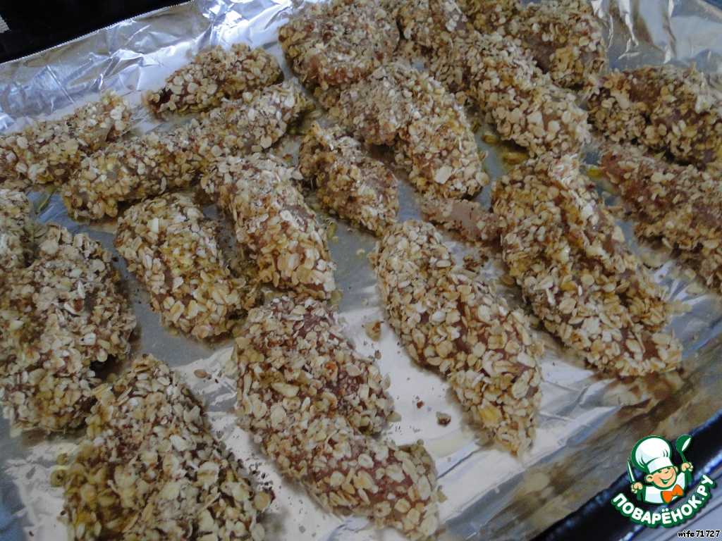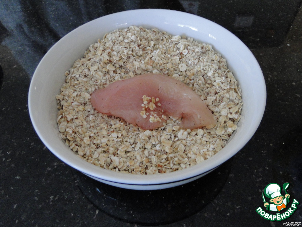 Теперь макаем грудки сначала в яйцо, потом в овсяно-миндальную смесь.