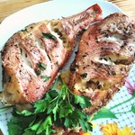 Подавать блюдо на фольге, так как должен остаться сок. Добавить овощи. Приятного аппетита!