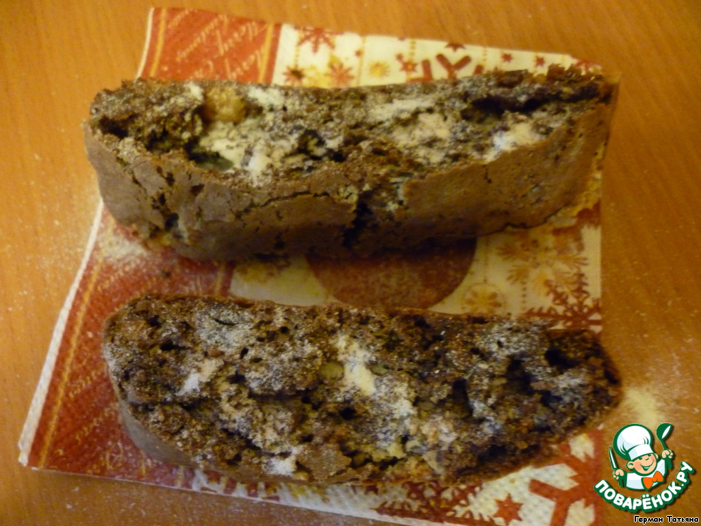 Продолжаю экспериментировать с блюдами на Пасху. Этот десерт подкупил тем, что его можно приготовить и взять с собой, и нет проблем с тем, что потечет крем или испортится форма. Потрясающий аромат шоколада и орехов наполнил всю кухню. Но если верить рецепту, самый сок этого десерта открывается в тот момент, когда вы опускаете его в вино или коньяк. Ну что может быть лучше, чем бокал кагора и бискотти на Пасху?!