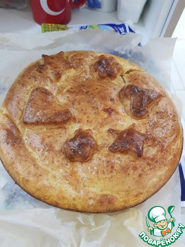 13. Накрываем оставшимся тестом пирог. Можно украсить и смазать желтком + 1 ст.л. молока. Наколоть вилкой.