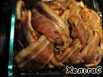 Завернём в рулет и, полив оставшимся из под лука соевым соусом со взбитыми яйцами и добавленными черными оливками, поставим в печь