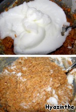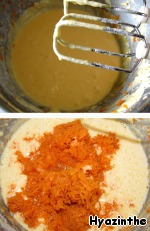Желтки взбиваем с сахаром до побеления, добавляем цедру и сок лимона, гвоздику, корицу, вишневую водку, тертую морковь. Перемешиваем хорошо. -