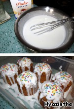 Для глазури белок слегка взбиваем, потом добавляем сахарную пудру и лимонный сок, продолжая хорошо мешать - получаем белую однородную глазурь.