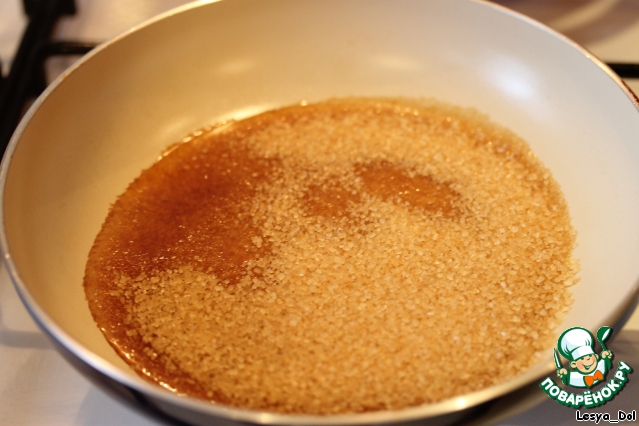 Приготовьте карамель: 2 ст. л. коричневого сахара и 1 ч. л. лимонного сока прогрейте на среднем огне до полного растворения сахара и коричнево-