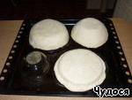 Берем посуду необходимого размера (у меня стеклянная форма для запекания с крышкой, крышку использовала для выпекания мелкой тарелочки под салат, и две стеклянные мисочки из набора салатников, которые с крышечками складываются друг в друга, надеюсь, понятно объяснила), обмазываем ее сверху растительным маслом и на донышко для страховки вырезаем кружечек пекарской бумаги. Отрезаем кусочки теста, раскатываем и накладываем на подготовленные формы, прижимаем тесто руками.