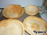 Даем нашим заготовкам для тарелочек подойти 10-15 минут и ставим в разогретую до 220 С духовку. Печем 25-30 минут. Достаем тарелочки и переворачиваем, пока горячие, чтобы выровнять донышко.