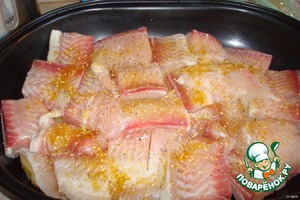На картофель выкладываем рыбу. Рыбу посыпаем специями.