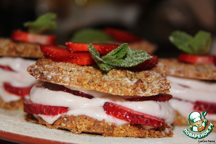 Накрыть еще одной лепешкой. Украсить свежей мятой, клубникой и сахарной пудрой.