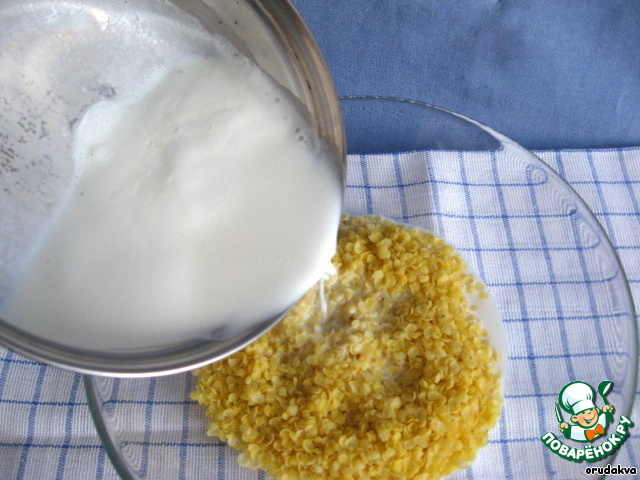 ... и зальем их 1 1/2 ст. вскипяченного молока. Накроем крышкой и оставим настаиваться и остывать.